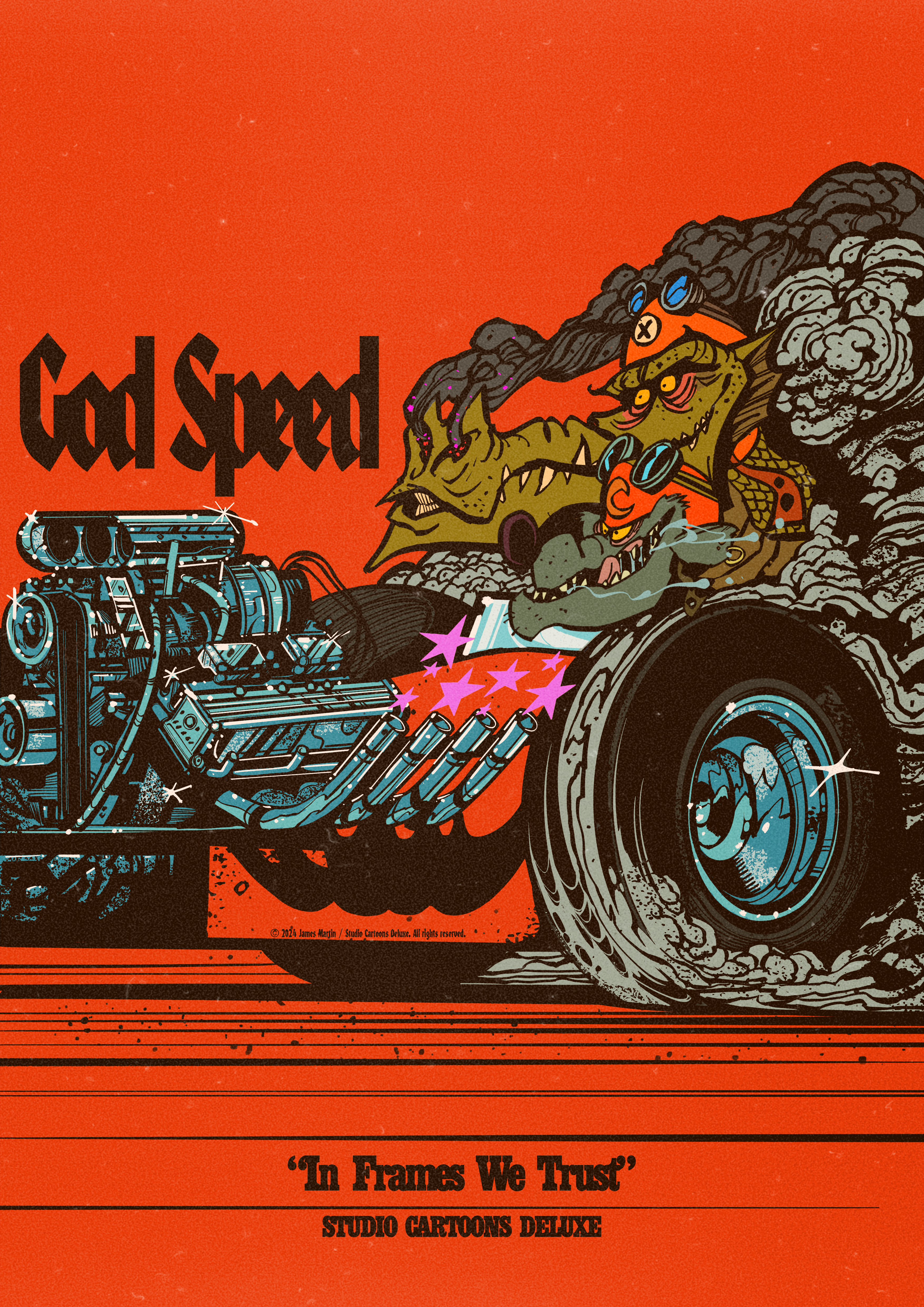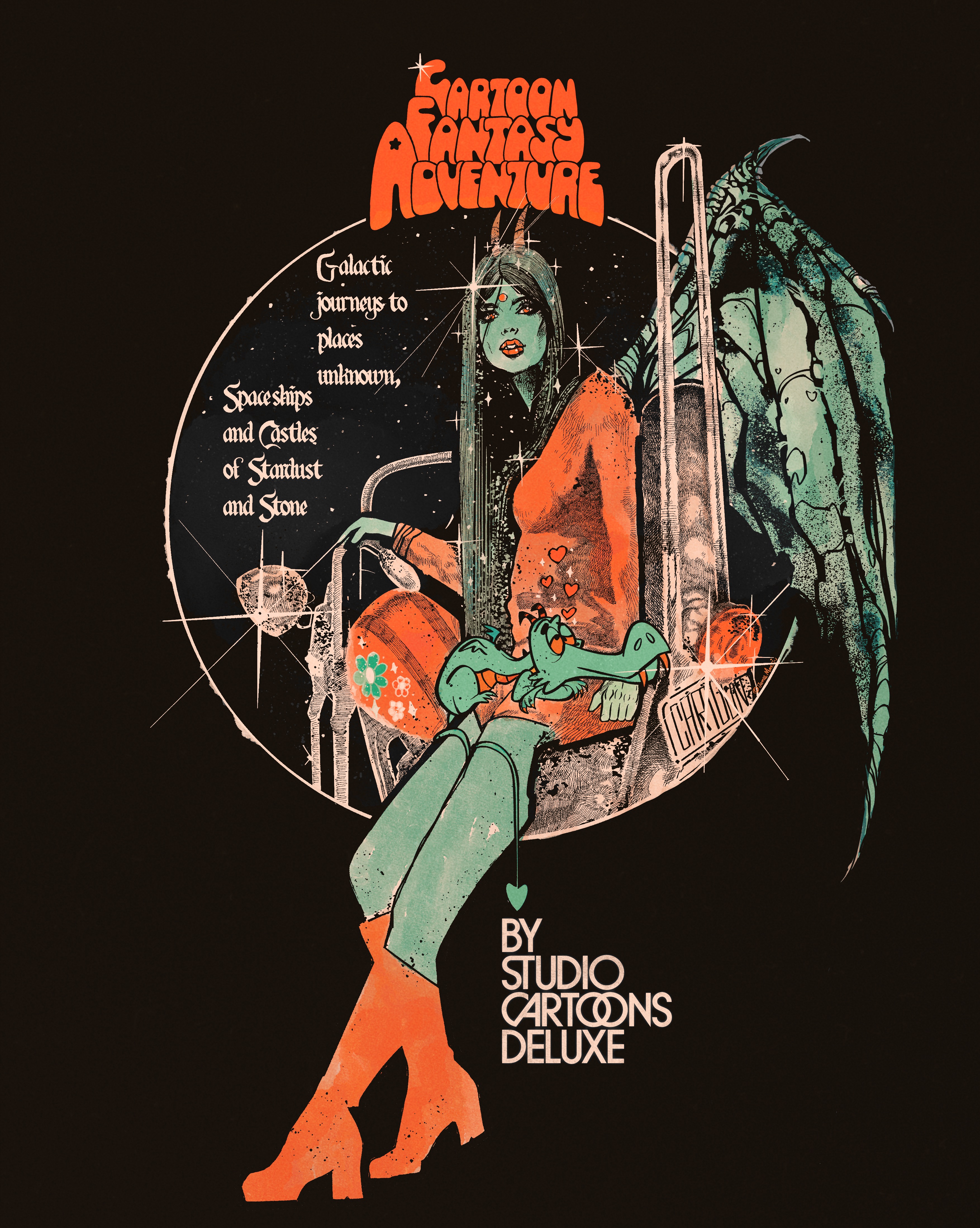 and apparel — commonly exploring retro cartoon & comic aesthetics in sci-fi, fantasy, psychedelia, horror, surf, snow, & motorsport.